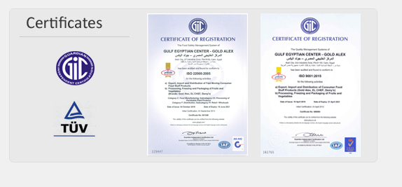 و تعتبر العلامة جولد أليكس هى المعنى الحقيقى للخضروات و الفواكه المجمدة حيث يتم الأنتاج و المراقبة طبقا لمواصفات الجودة العالمية و متطلبتها . قامت الشركة بالحصول على شهادتى الأيزو22000: 2005 و الهاساب . لذلك جولد أليكس تضمن منتجاتها من المزرعة إلى المائدة مباشرة بدون اضافات أو مواد حافظة.